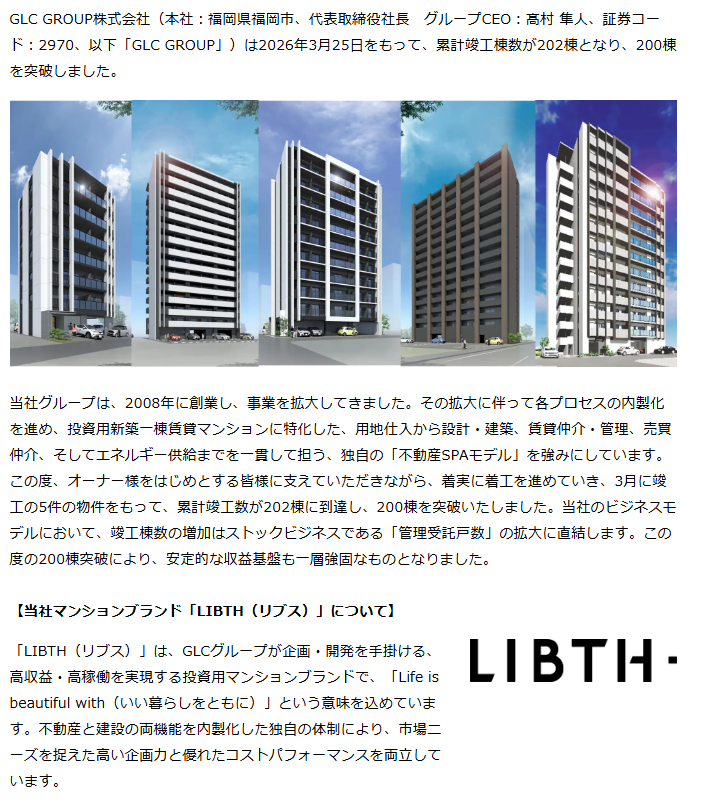2026.03.26 お知らせ GLC GROUP、累計竣工棟数200棟突破 今後は首都圏にもエリアを拡大しながら、2028年には福岡、熊本、沖縄エリアで2025年比の2.6倍となる、年間着工45件を目指す